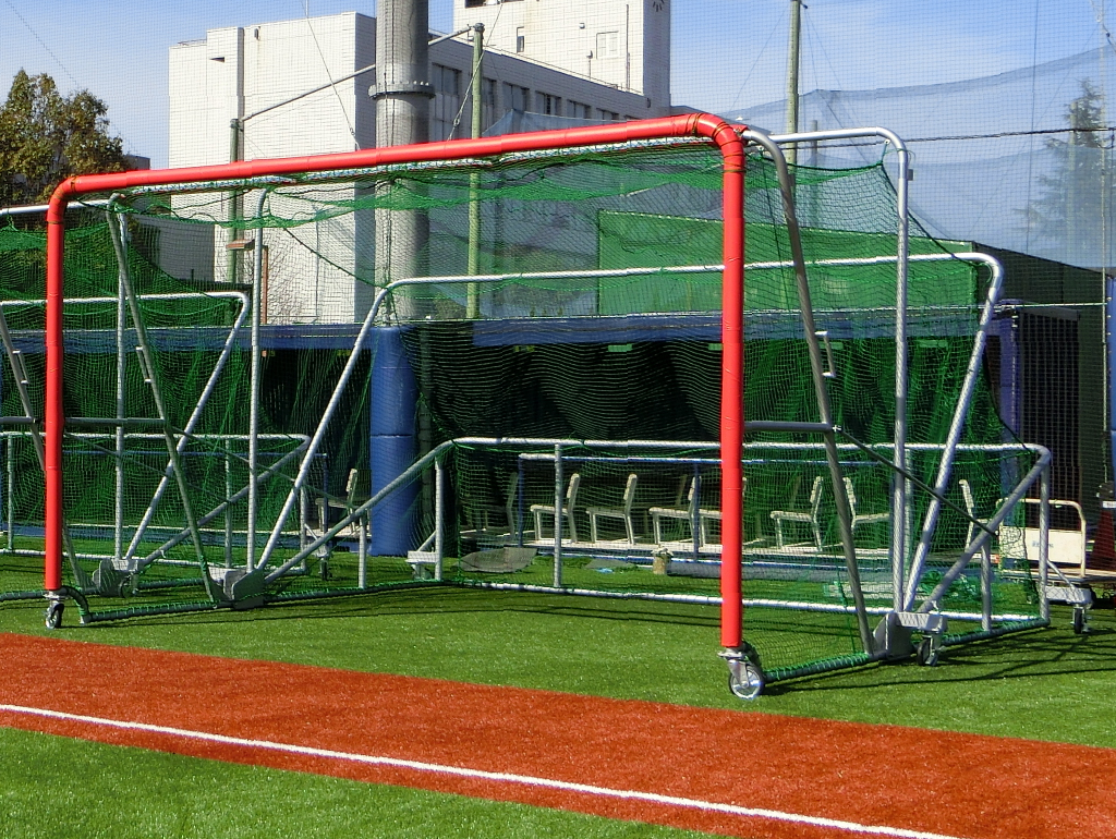前面パイプ防護マット(オプション) 全開寸法:前高3.1×幅5.6×奥行5m キャスターφ200 収納寸法:前高2.08×幅5.6×奥行3.1m 主材φ60 ネット:ポリエチレン440T/60本 37.5mm目 重量180kg