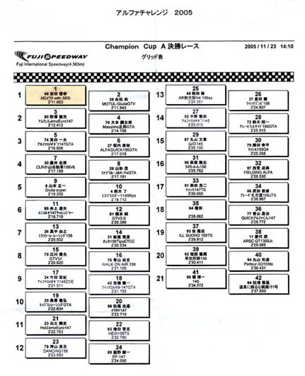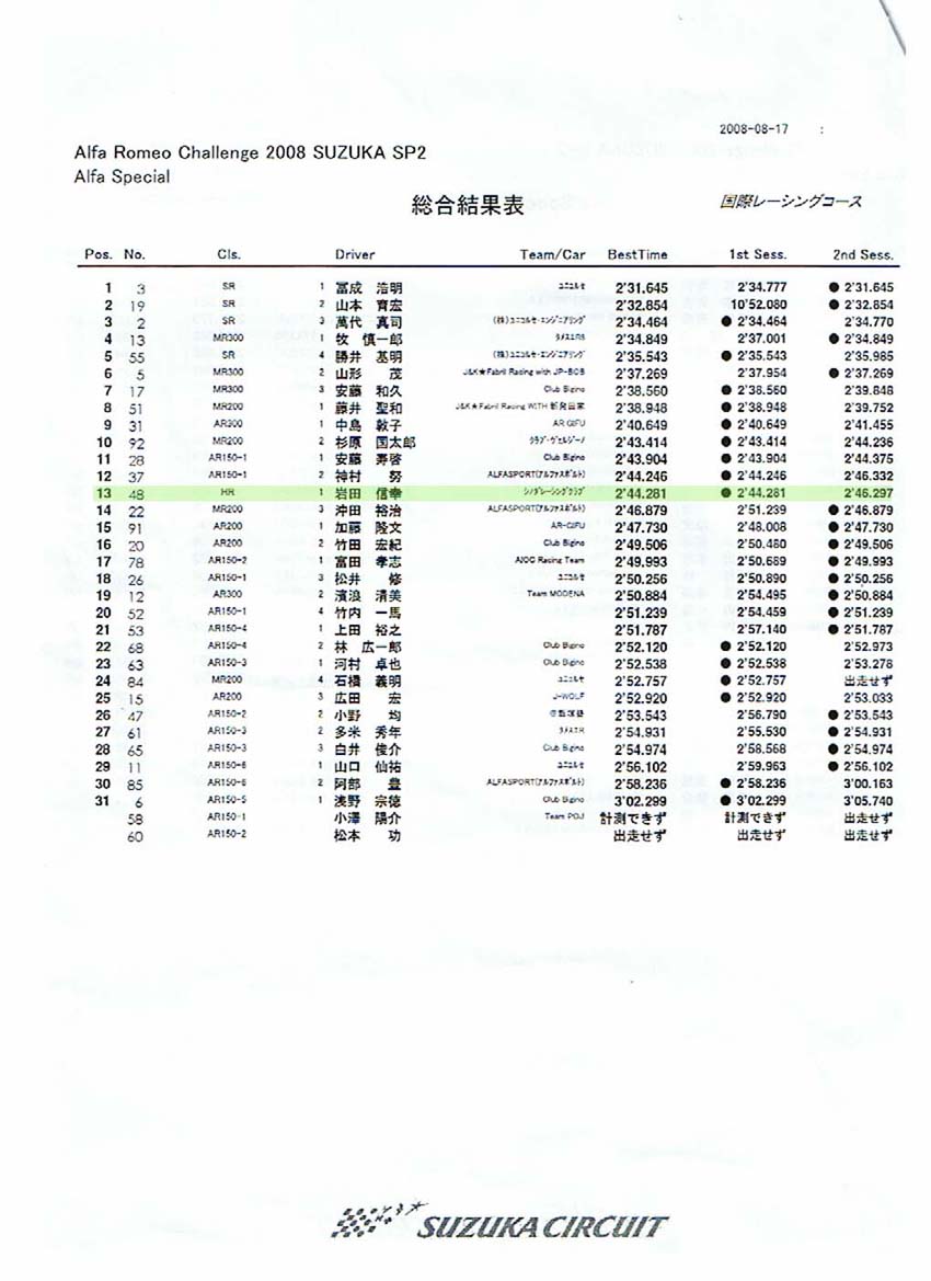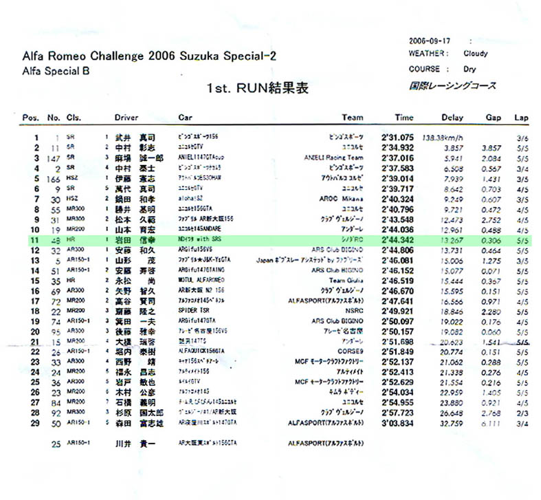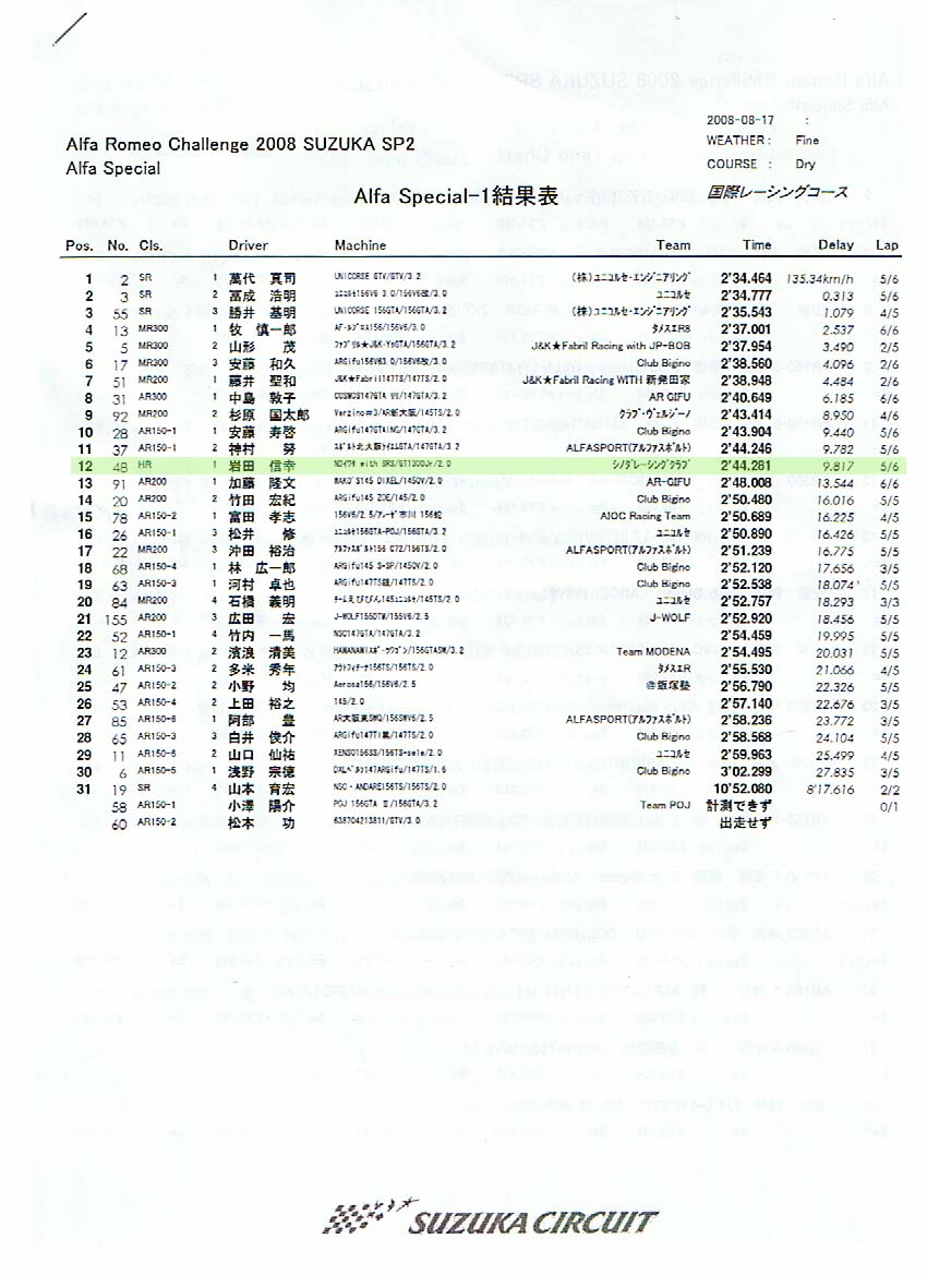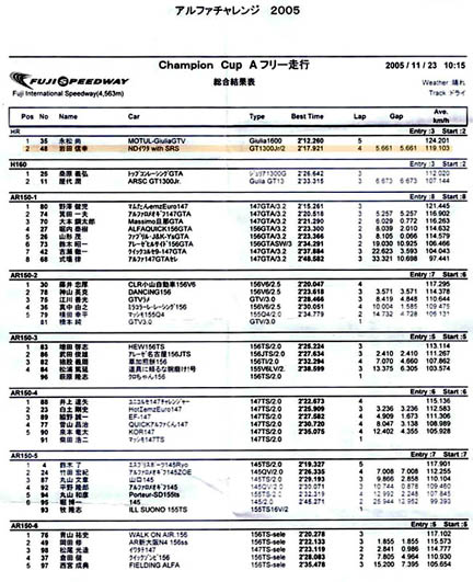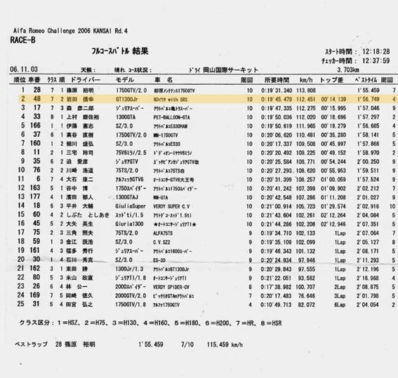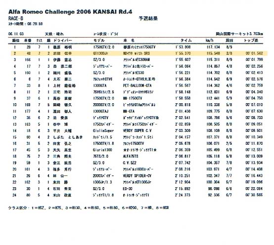 昨年大クラッシュをした逆バンクのトラウマを気力で乗り越えて、予選では昨年のタイムを上回るも、中山選手に先を越された。しかし、ALFA勢が2,3位と上位に並ぶのは気持ちがよい。決勝でもがんばるが、周りの車について行くのに精一杯。来年は何か対策を考えないと。