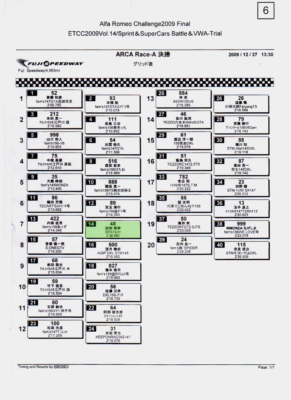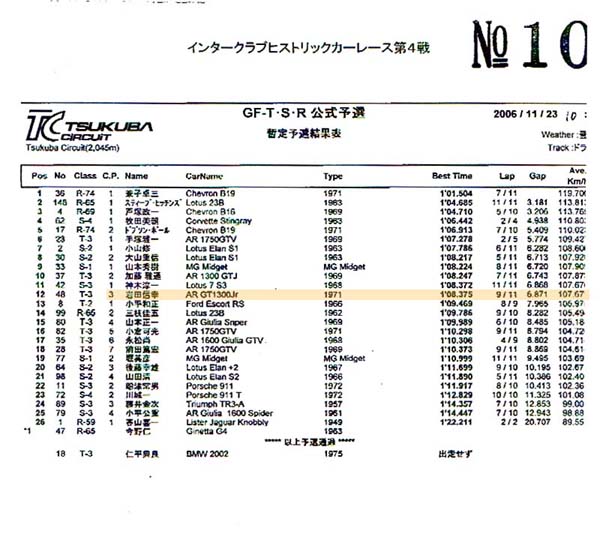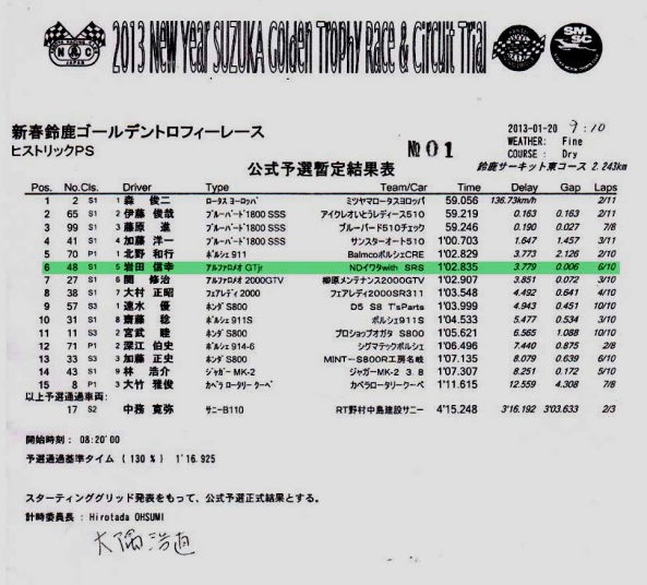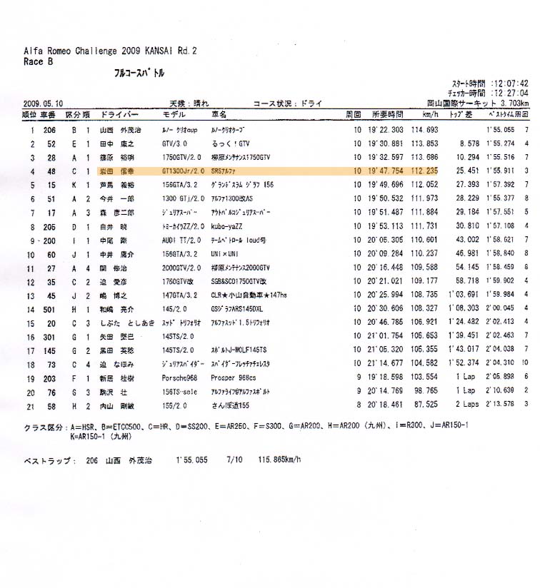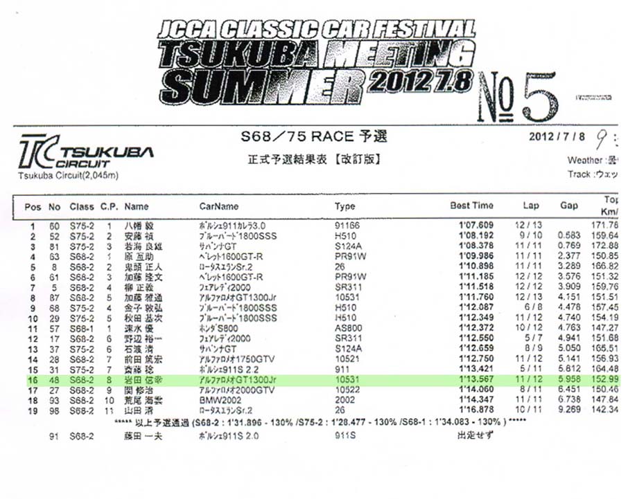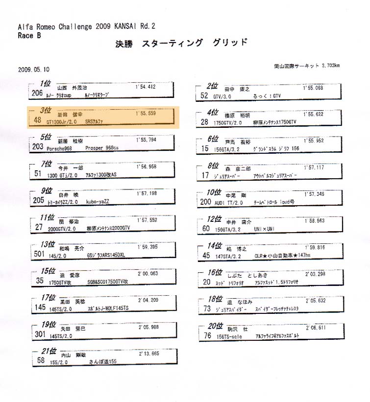 昨年大クラッシュをした逆バンクのトラウマを気力で乗り越えて、予選では昨年のタイムを上回るも、中山選手に先を越された。しかし、ALFA勢が2,3位と上位に並ぶのは気持ちがよい。決勝でもがんばるが、周りの車について行くのに精一杯。来年は何か対策を考えないと。