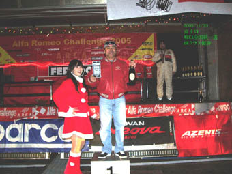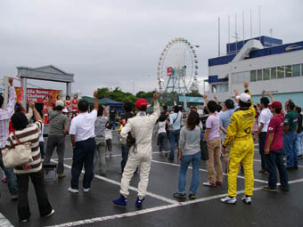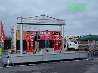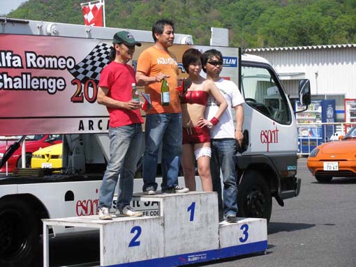 レース後の表彰式ではおなじみの顔ぶれと仲良く記念撮影。シャンパンファイトは無しだった。当日は30度を超える夏日だったので、露出度の多い衣装のお姉さんも、汗を拭き拭き笑顔を振りまいていた。決勝結果 |