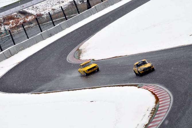 レース当日は長いレース経験の中でも極めてまれなコース状況で、早朝から雪が降ったりやんだりで、路面温度は全くあがらず、一日中ウエット状況だった。 |