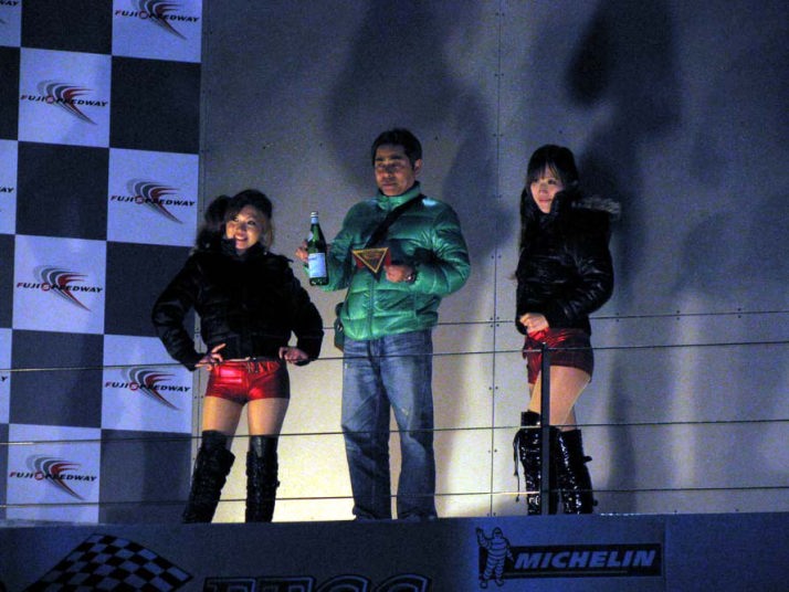 今回は、5名ものレースクイーンに囲まれてトロフィーを受け取る岩田選手。