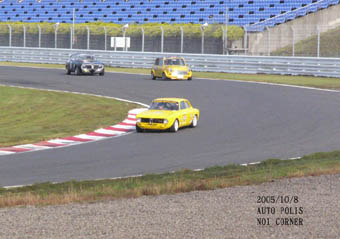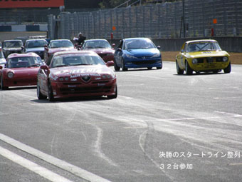 フリー走行の15分ではコースを覚えることもできず、予選までにコース図を見ながら一人でぶつぶつ言っていたが、左隣の写真のように、予選時に、知り合いの147GTAドライバーに引っ張ってもらったおかげで、ポールをゲット出来た。決勝の一週目はTOPでストレートに戻るも・・