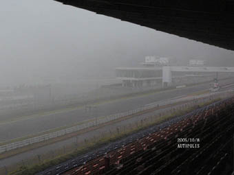 予選が始まってもこの状態だが、気温が上がるにつれ徐々に視程も回復。この調子でいけば昼頃には回復するようだ。