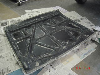 裏はこんな感じに、ダクト部分は事前にカットしておきました。裏骨は少しでも軽くするためのにと一枚にしましたが、市販のものは2枚構造となっているようです。強度や製品の仕上がり具合などを考慮すると2枚は必要なようです。 この時点での重量は6キロを切る程度でした。 |