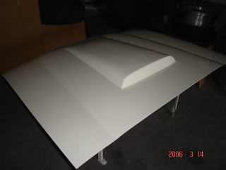 貼り付けたガムテープの上からFRPを2〜3枚貼り付け、成形、その後ポリパテで成形します。 注・・・今回エアゾルタイプのウレタンを使用し失敗だったのがこの成形過程に大きな支障が出たことでした。ウレタンの成形からFRP貼りまでの作業を一連で行えればまだ良かったのでしょうが、しばらく時間をおいたため、ウレタンが変形(落ち着くまでにかなり時間がかるようです)し後の成形が大変でした。 成形が完了したら、一度ダクト部分をボンネットから外し、耳の部分をカットし、した処理時に貼ったガムテープなどを剥がし、直接ボンネットに貼り付けます。 |