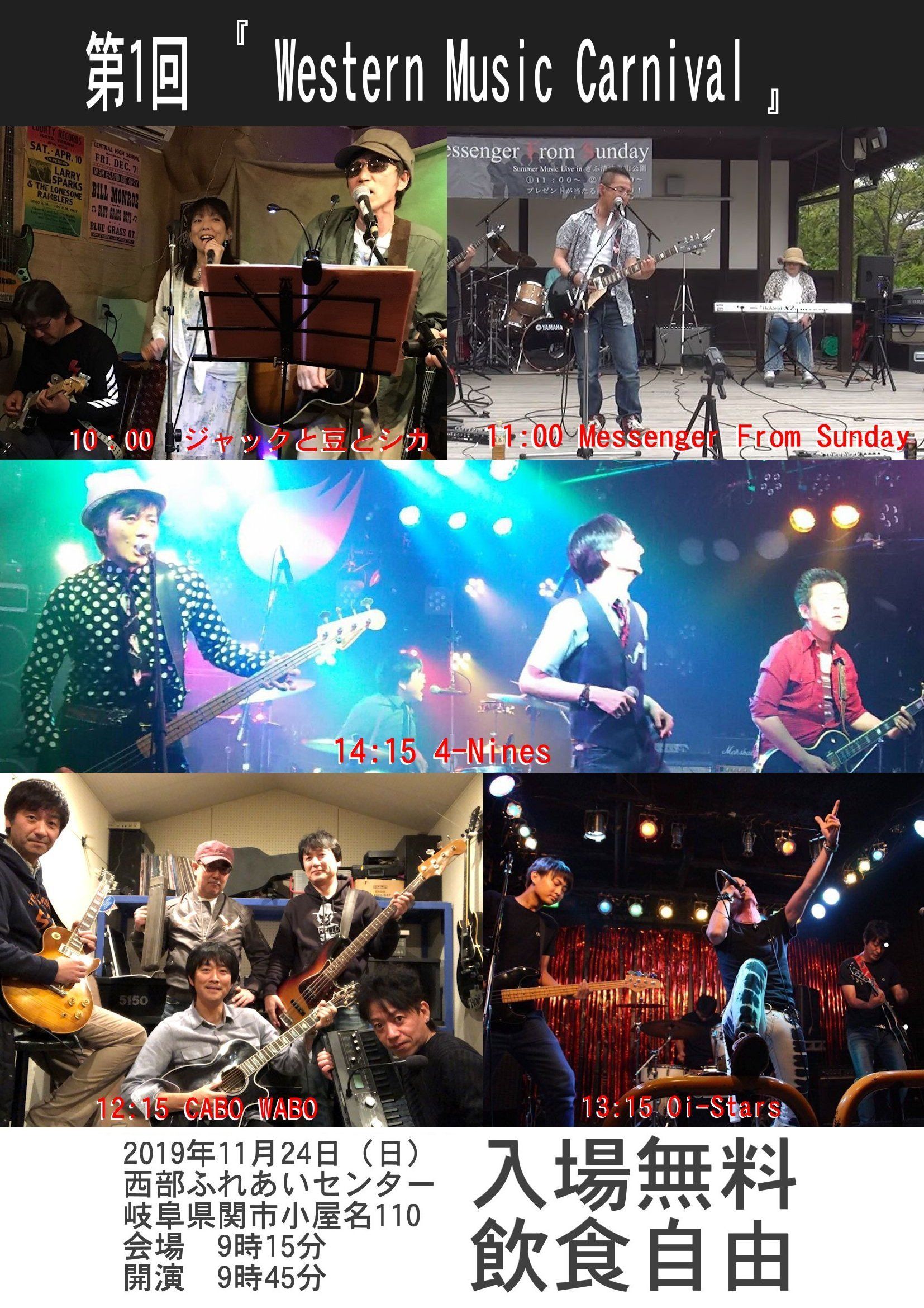 | 14:15 | 4-Nines | Western Music Carnivalのトリを務めますは、本格派アメリカンブルースロックバンドです。関市はもとより岐阜市、名古屋のライブハウスで活躍されています。超カッコいい!曲を知らない方も、全然大丈夫!バンドの熱量で楽しめます。トリにふさわしいバンドです。お金を払ってでも見たいバンドの演奏が、タダなんだから、見なきゃ損!聴かなきゃ損! |
