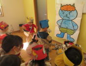 新聞紙で作った豆を、鬼にめがけて投げます。これは、まだ練習。この後、本物の鬼さんが登場しましたよ!大きいけど優しくて可愛い鬼さん。だけど、やっぱり泣いちゃい子もいます。先生に抱きしめてもらいながら頑張って、豆を投げました!最後に、鬼さんは、がんばった皆にプレゼントをくれましたよ!