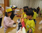 全園児でお店屋さんごっこをしました。各クラス手作りの品物が並び、お買いもごっこを楽しみました。