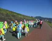 全園児で長良川河川敷を歩きました。年長さんが年少さんの手を引いて幼稚園からの距離を歩きました。良いお天気でみんなよく頑張りました。