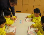 「明日はここに貼ってね」先生に教えてもらって、シールを自分で貼ります。