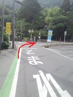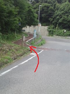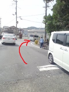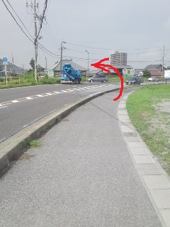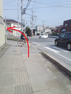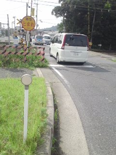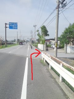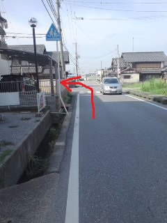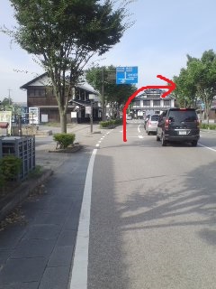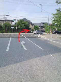 信号交差点の手前、 民家の方へ、右 (信号交差点で 右折の場合歩道なし) |