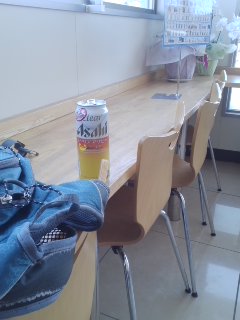 ローソンにテーブルや椅子が あり、休憩できる アルコールチャージ |