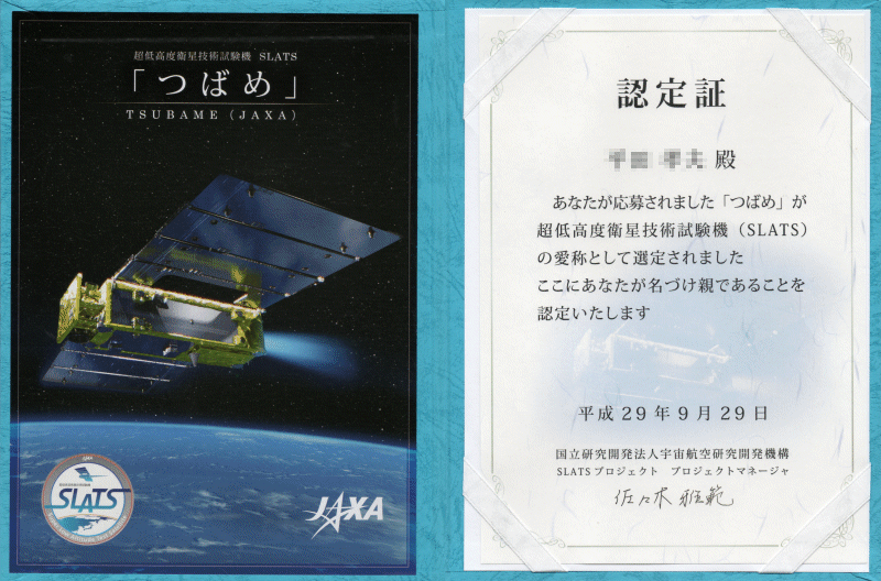 「つばめ」名付け親 認定証