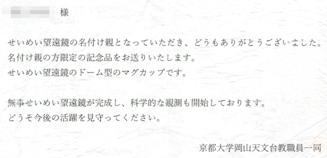 京都大学岡山天文台光学赤外線望遠鏡「せいめい」名付け親