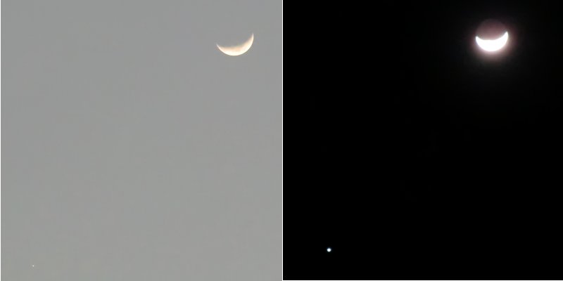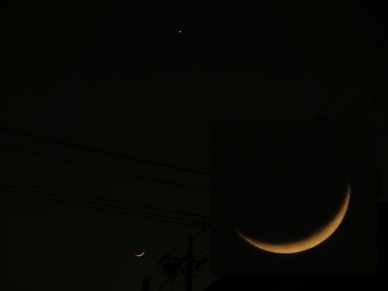 2012年4月24日 20:10 日食まであと27日 月齢3.2 高度11.5°金星 高度21.4°-4.5等級