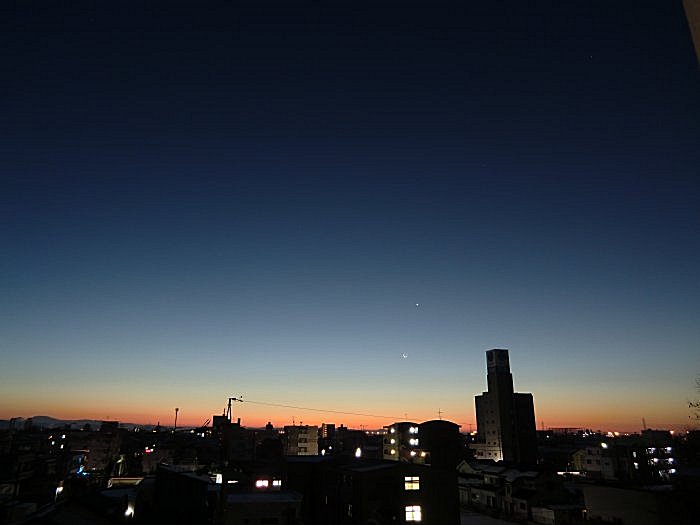 2012年12月12日 6:13 月(月齢28、高度9.2°)・水(高度9.4°-0.5等級)・金(高度14.7°、-4.0等級)