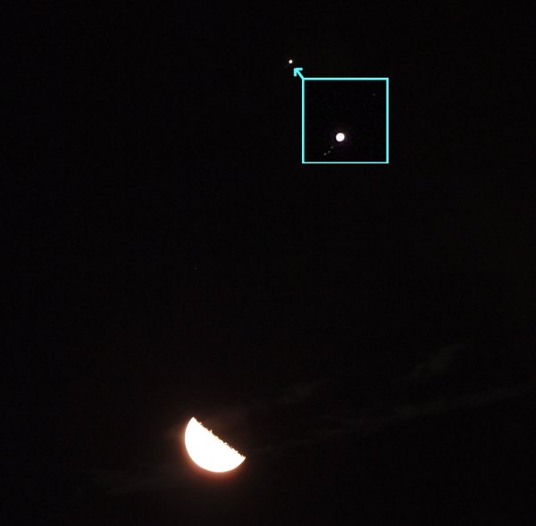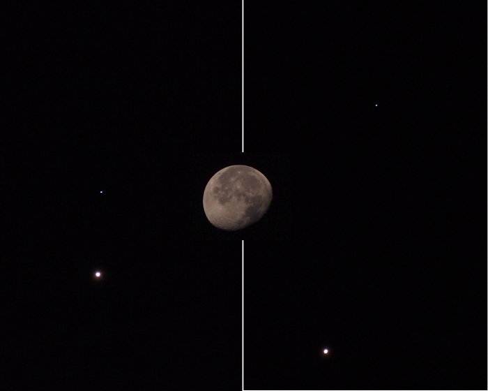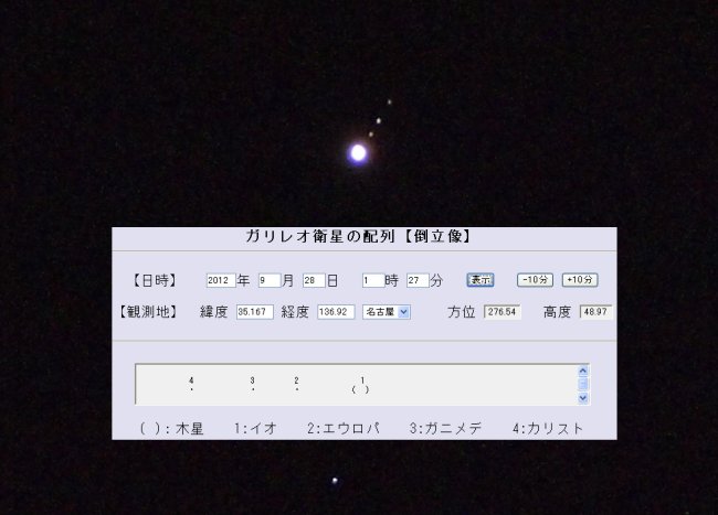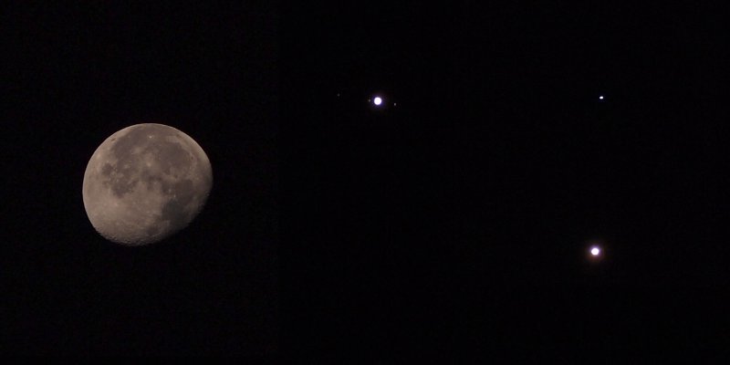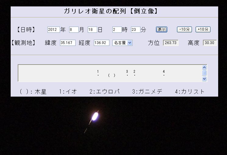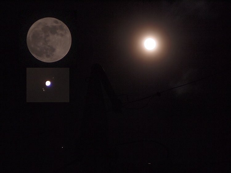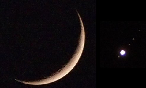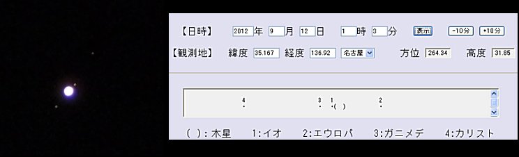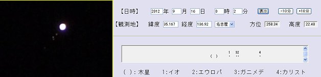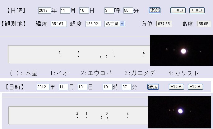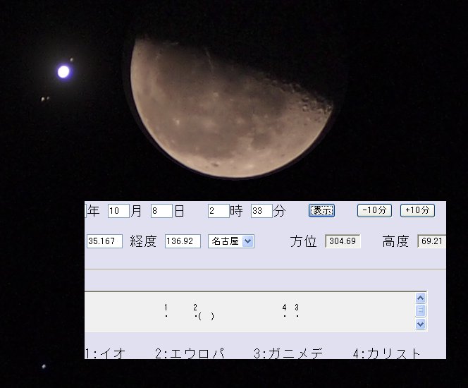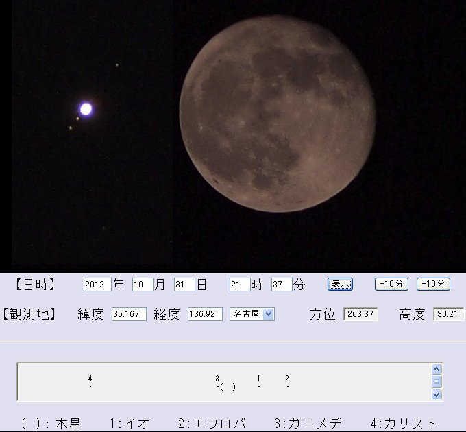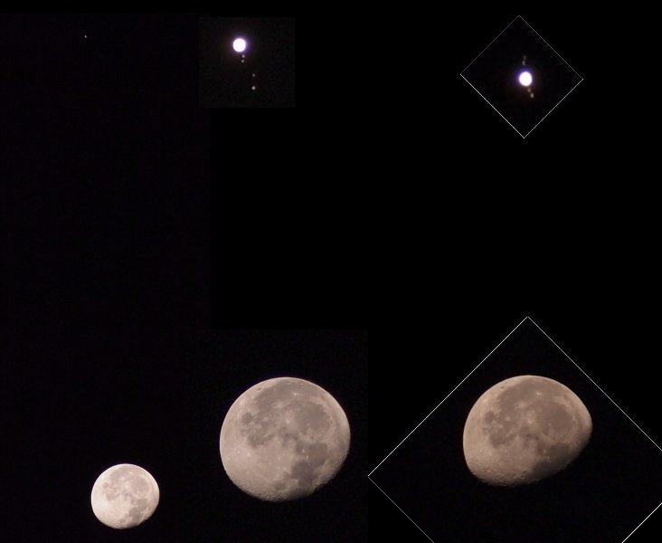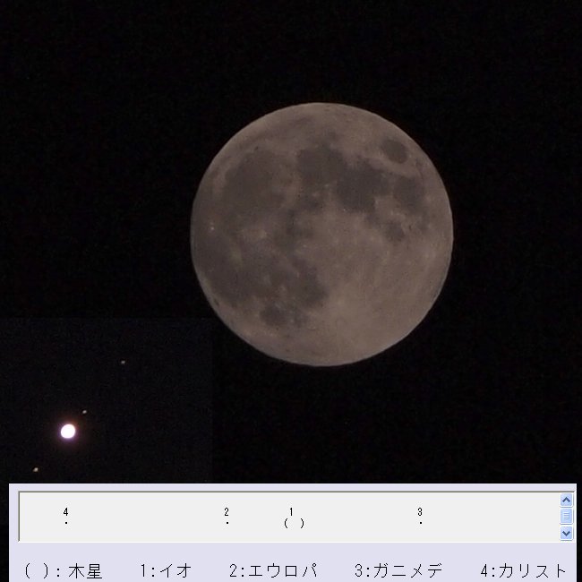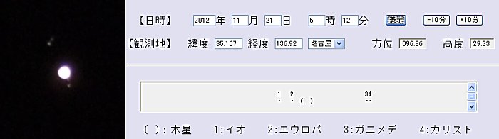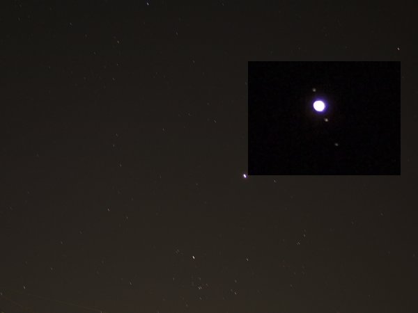 2012年11月16日 ガリレオ衛星 19:34 露出1秒 F5.6 150mm ISO 200と月 17:20 露出1/320秒 F5.6 150mm ISO 1600 by E-PL2