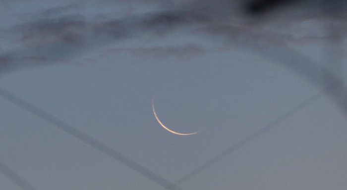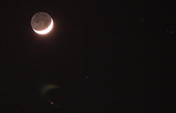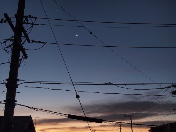 2012年12月16日 18:09 月(月齢3.0、高度19.8°)地球照とジェット機 露出2秒 F5.6 150mm ISO 500 by E-PL2