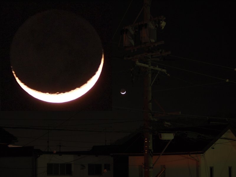 2013年2月11日 18:08~09 月没(月齢1.1、高度5.5°) 露出1/5秒 F5.6 150mm ISO 800 by E-PL2