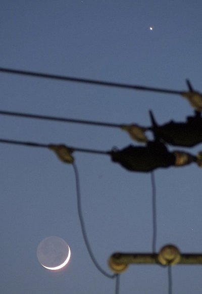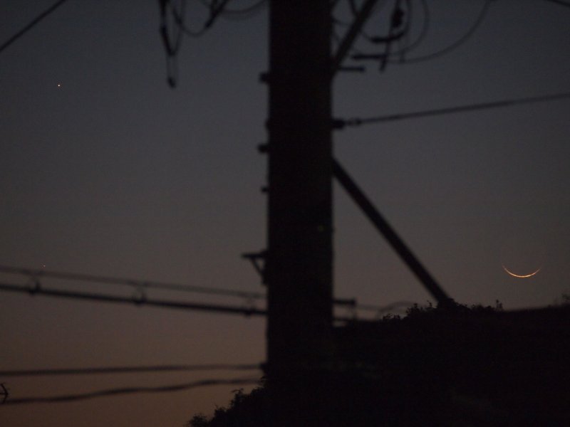 2013年2月11日 17:53 電柱から月(月齢1.1、高度8.6°) 露出1/30秒 F5.6 150mm ISO 200 by E-PL2