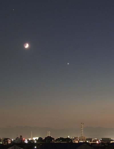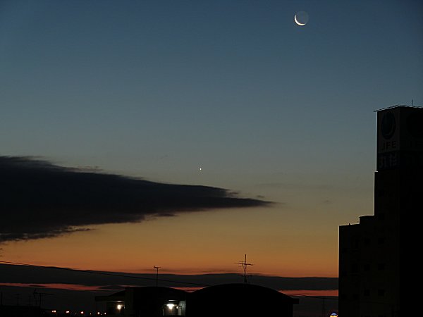 2013年1月10日 6:26 月(月齢27.5、高度12.8°) 金星(-3.9等級 高度6.6°) 露出2秒 F5.0 105mm ISO 64 by Ex-H15